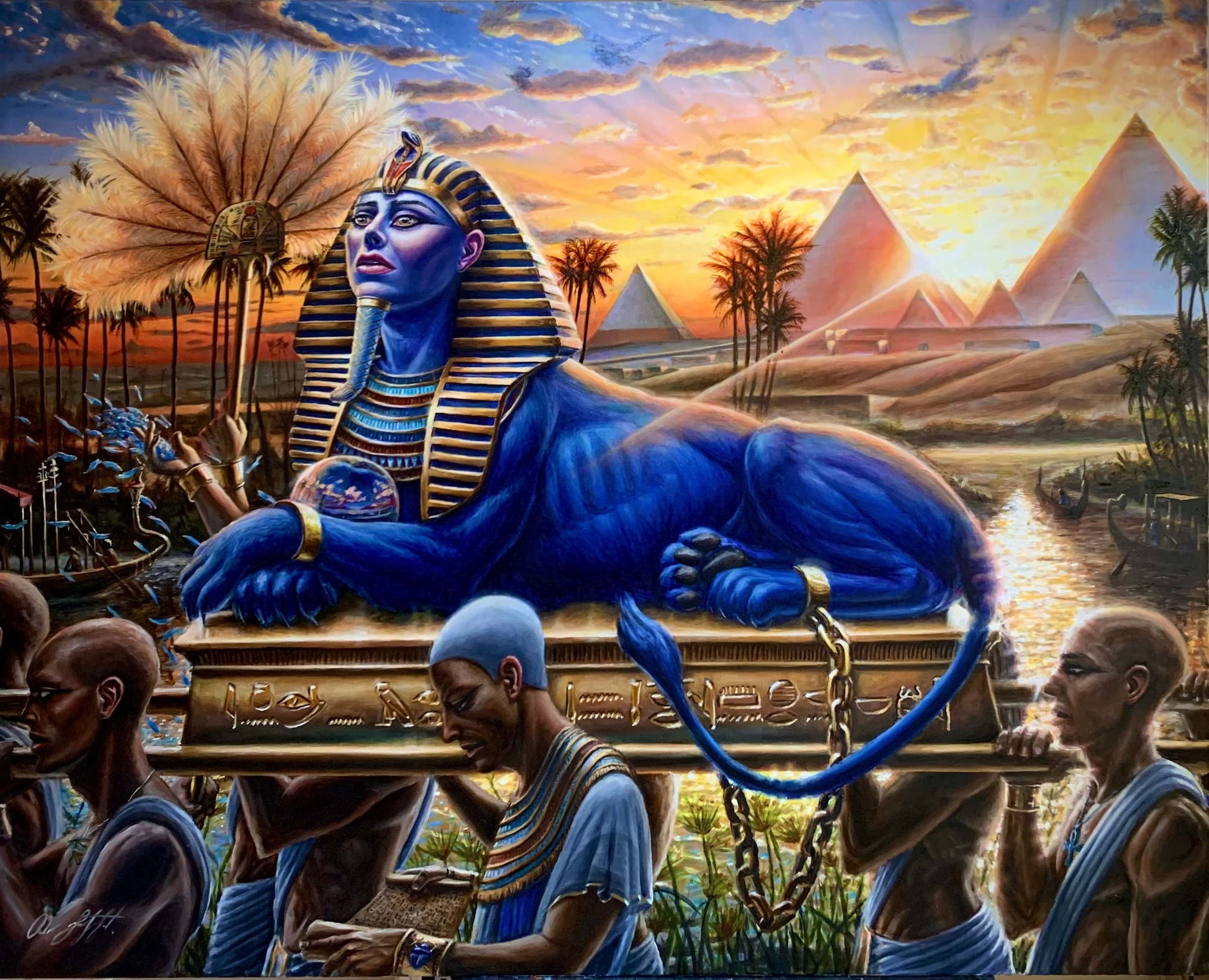 It represents Ra-Horakhti in his ascending solar form. Eight priests carry the Sphinx of Giza alive, as a vessel of the knowledge from the ancient Egyptian Mystery Schools, transferring it to another civilization. One priest reads The Myth of Creation according to the theology of Memphis, faithfully inscribed on a papyrus. The riddle in hieroglyphs created by the artist reads: