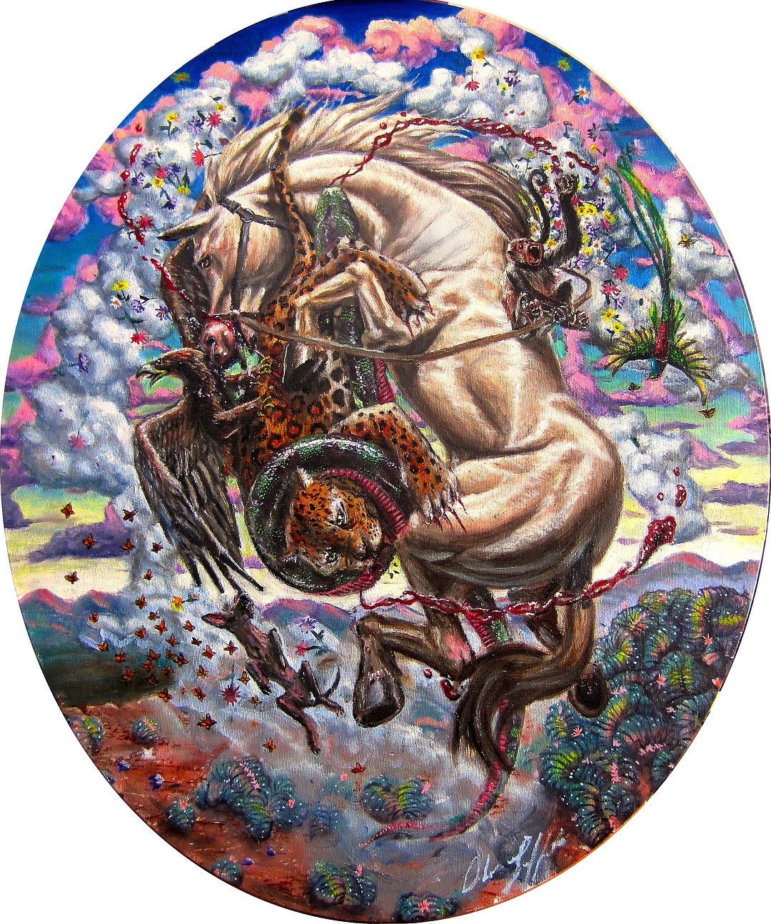 The jaguar, snake, monkey, eagle, Xoloitzcuintli dog, and quetzal are Mexican animals, while the horse represents the Spanish Conquest of Mexico. Together, they form a fusion of bloodlines that represent not only modern Mexican society but also the different areas of the human brain struggling for control. The sacred peyote plant is located at the bottom; this is a genetic and spiritual struggle.
